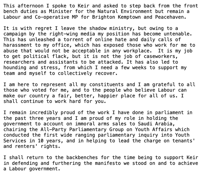 owing to a campaign by right-wing media my position has become untenable. I shall return to backbenches for the time being to support Keir in defending and furthering the manifesto we stood on and to achieve a Labour government