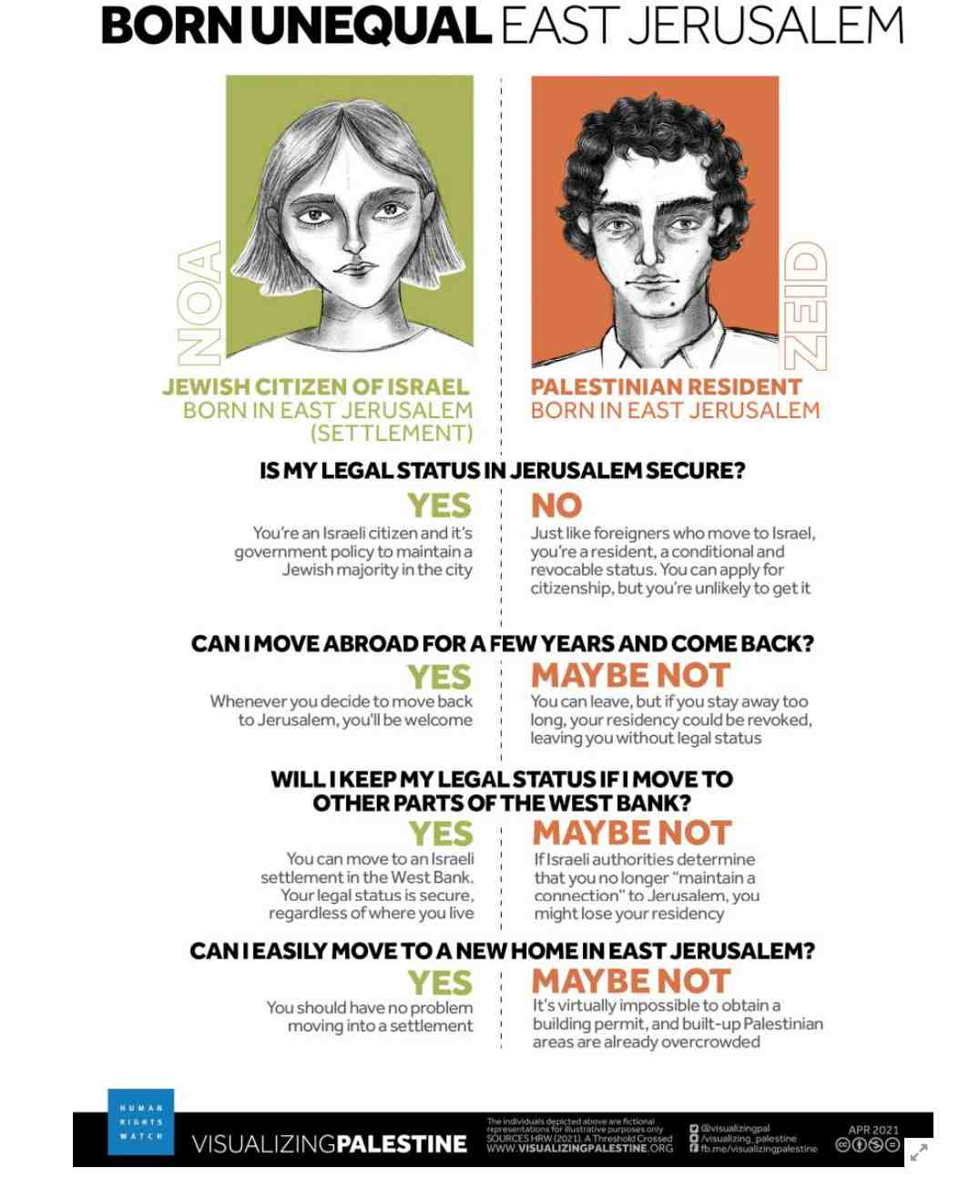 “These policies, which grant Jewish Israelis the same rights and privileges wherever they live and discriminate against Palestinians to varying degrees wherever they live, reflect a policy to privilege one people at the expense of another.”