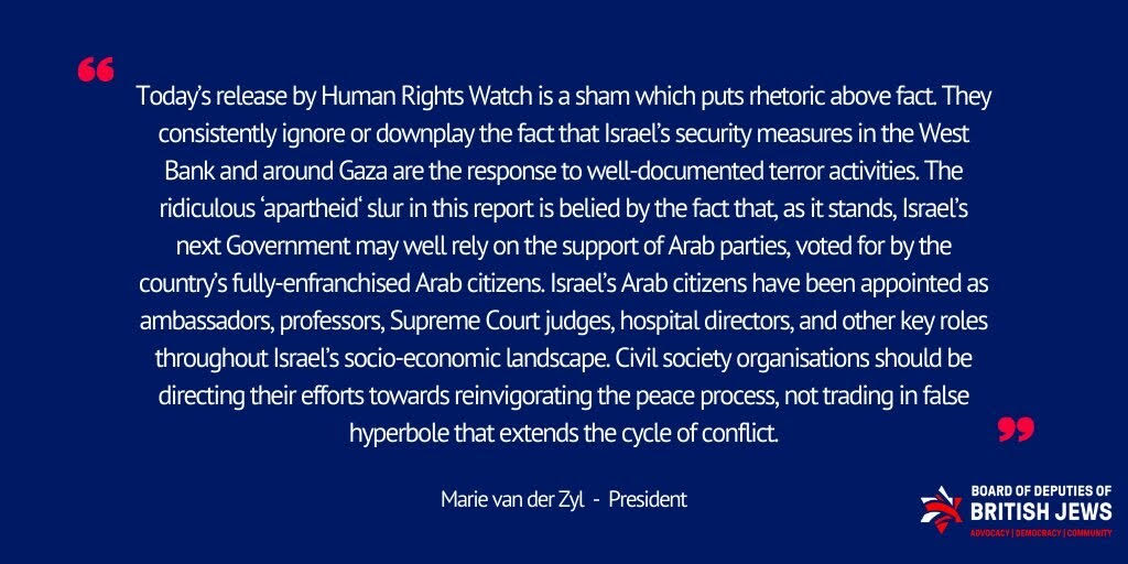On Tuesday Human Rights Watch accused Israel of the Crime of Apartheid – immediately the Board of Deputies, called it a ‘slur’
