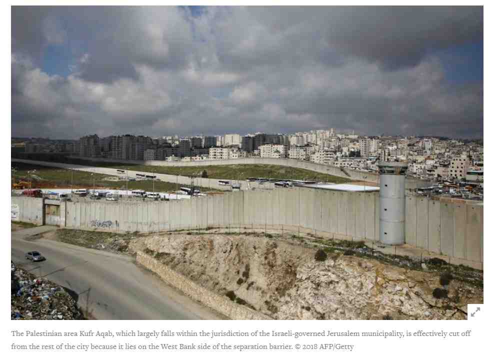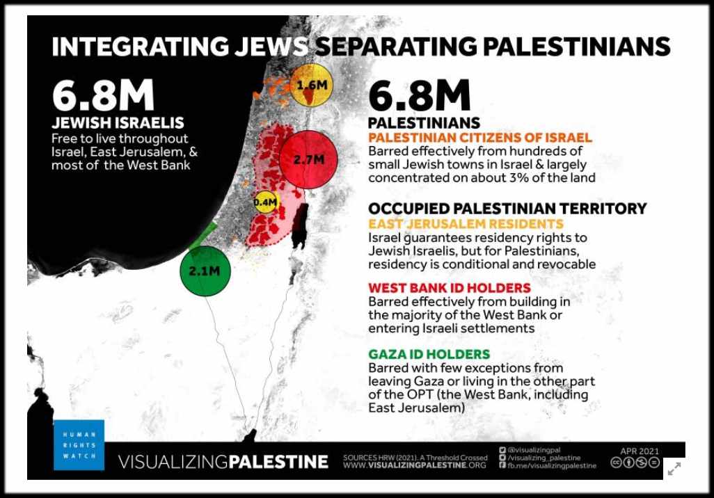 Last week, in a 213 page report ‘A Threshold Crossed’ Human Rights Watch provided detailed evidence of Israel’s apartheid crimes. It argued that Israel was ‘Seeking Maximal Land with Minimal Palestinians’. Under ‘Discriminatory Restrictions on Residency and Nationality’ it showed how 270,000 Palestinians outside the West Bank and Gaza when the territories were captured in 1967 have been denied residence and another ¼ million Palestinians who were abroad ‘too long’ have also had their right of residency revoked. This would not happen if they were Jewish and is prima facie evidence of an apartheid state.