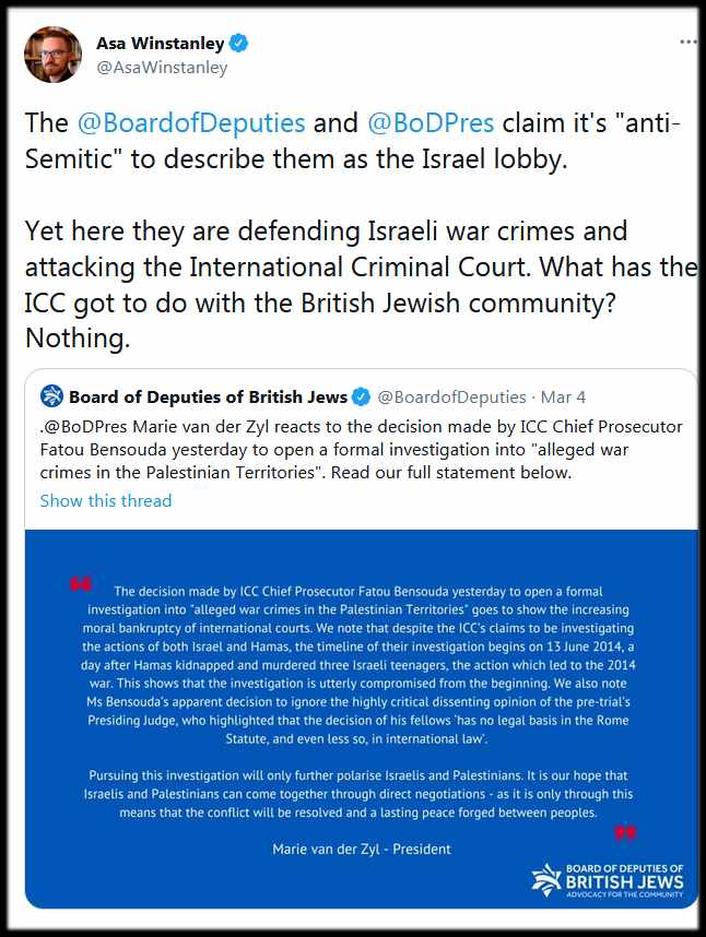 The Board of Deputies say that calling them part of the Israel lobby is ‘anti-Semitic’ yet, as Asa Winstanley observed the Board of Deputies repeatedly defends Israel, right or wrong. It attacked the decision of the International Criminal Court to investigate Israeli war crimes as evidence of its ‘moral bankruptcy’. ‘What’, he asked, ‘has the ICC got to do with the British Jewish community? Nothing.’