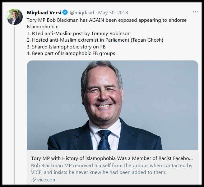 Miqdaad Versi of the Muslim Council of Britain, tweeted: “Deeply disappointing to see Tory MP Bob Blackman once again endorse Islamophobia.” Blackman had previously retweeted an anti-Muslim post by Tommy Robinson.