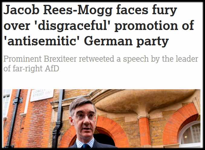 In April 2019 Mogg tweeted a speech and video by Alice Weidel, Leader of Germany’s AfD whose former leader Frauke Petry called for refugee boats to be fired upon. This led to the AfD’s expulsion from the ECR. AfD members march regularly alongside neo-Nazis. It is a party full of holocaust deniers and neo-Nazis but it is also pro-Israel. This has led to it being put under formal state surveillance. Even the Zionist Jewish Chronicle had an article Jacob Rees-Mogg faces fury over ‘disgraceful’ promotion of ‘antisemitic’ German party.
