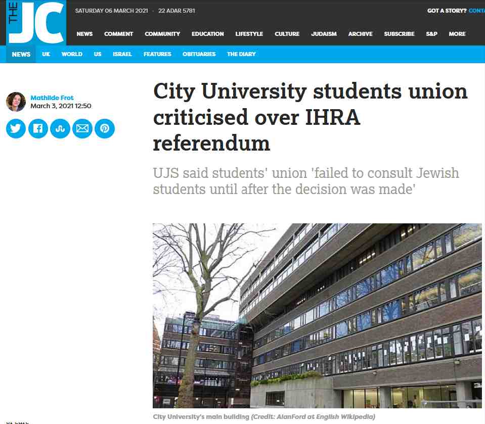 The same happened at City University where the student union decided to hold a referendum over the IHRA. [City University students union criticised over IHRA referendum]