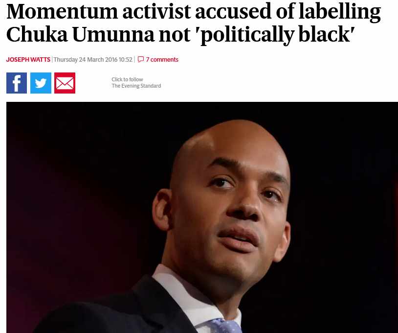 Likewise my description of Chuka Ummuna as ‘White politically” was a statement of fact. He was labelled as such by Black activist Marlene Ellis. In other words a collaborator with White racism or an Uncle Tom.