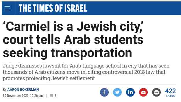 It is now an expulsion offence to tell the truth about Israeli racism. Only last week a lawsuit trying to force the Israeli city of Carmiel to provide transportation for Arab children to local schools was dismissed out of hand to protect “the Jewish character of the city.”