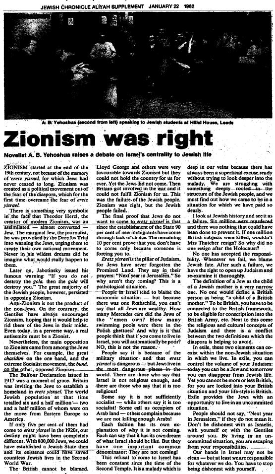 Let me quote to you the message of an Israeli poet and Zionist, A B Yehoshua in a lecture to the Union of Jewish Students (JC 22.1.82).
