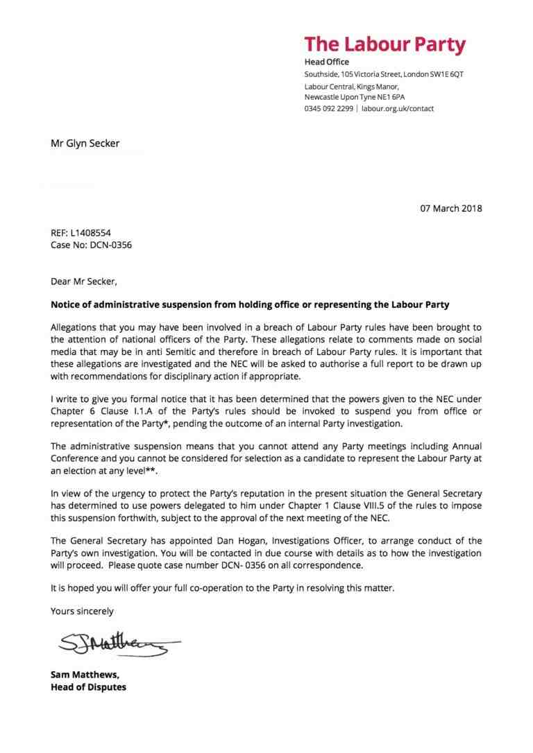 I have now been told by an NEC member that the case of Glyn Secker never went to the Disputes Committee of the NEC. In what appears to be the last stand of that racist crook, Iain McNicol, Glyn was administratively suspended by McNicol alone. Administrative suspensions take place when a case is that serious (e.g. rape) that they can’t wait for the decision of the Disputes Committee and have to be carried out immediately.