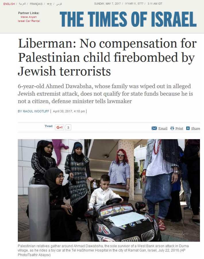 the house of the Dawabsheh family burning alive 18 month Ali Dawabsheh and killing both parents. There was just one survivor, 4 year old Ahmed