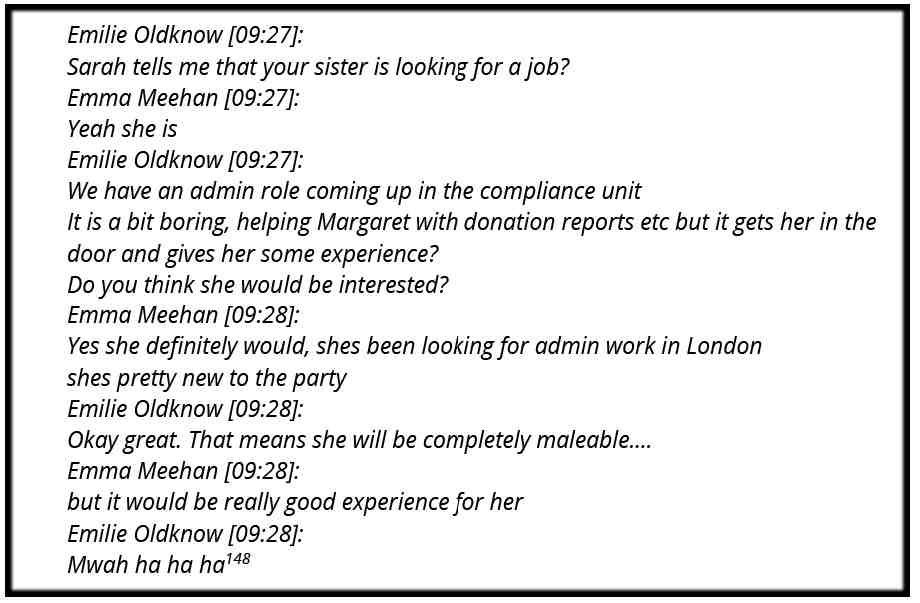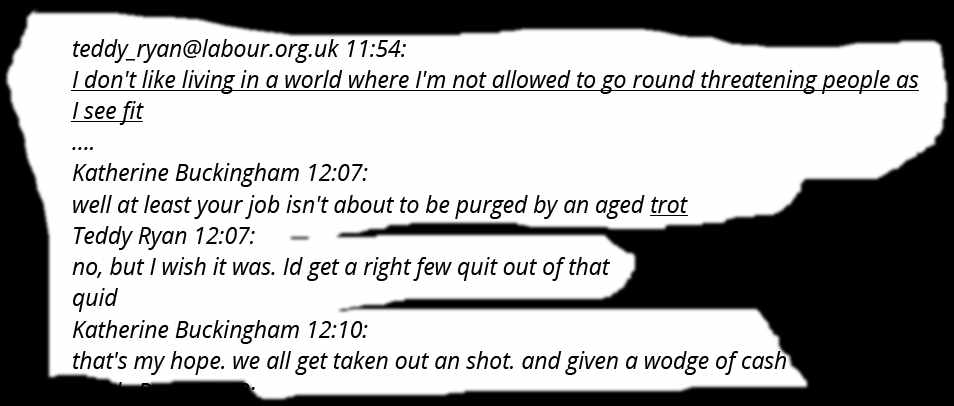 On 15 June 2015, Head of Press and Broadcasting Jo Green suggested to Simon Jackson that “anyone who nominates corbyn’to widen the debate’deserves to be taken out and shot”. Jackson agreed: “quite.” On 15 September 2015 Dan Hogan said that a staff member who had “whooped” during Corbyn’s speech “should be shot”. (51)