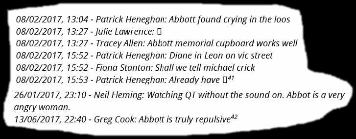In February 2017 she said Diane Abbott “literally makes me sick”. Senior staff discussed Abbott crying in the toilets and telling Michael Crick, a Channel 4 reporter, where she was: (43)