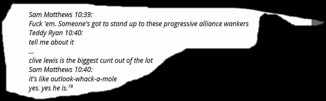 The problem was the widespread support for Labour First amongst the investigative staff. In April 2016 Francis Grove-White, Labour International Policy Officer, met Luke Akehurst from “Labour First”, and commented to Greening that it was “very encouraging to hear how organised they are regarding conference.” (62)