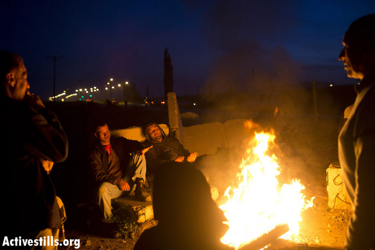 | Workers try to keep warm near a campfire while awaiting transportation in the early morning cold near Eyal checkpoint. |