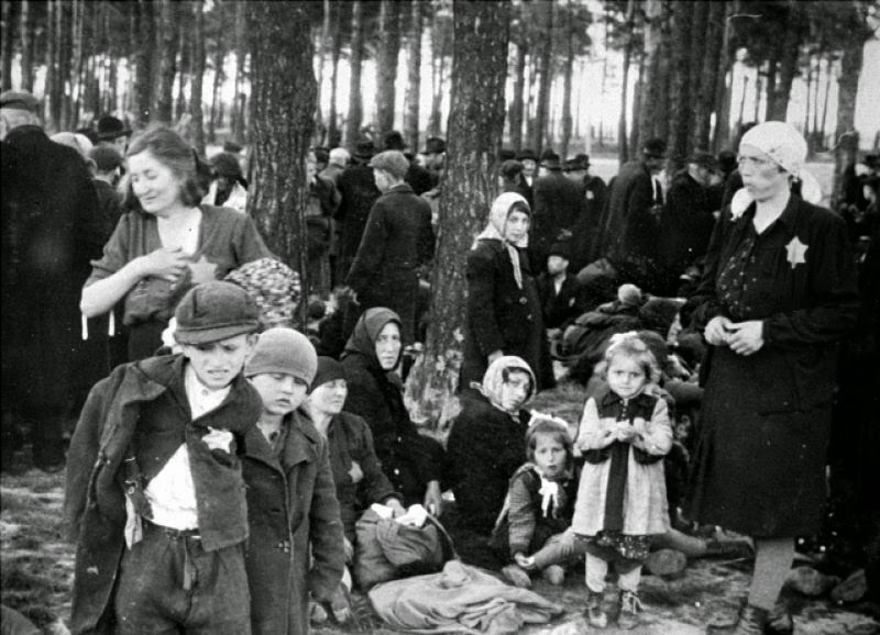 | Jews from Carpathio Ruthenia waiting in Birkenau’s Birch Forest before they are gassed. They will have had nothing to drink for the 2-3 days of the journey |