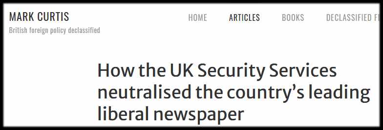 There was a time when the Guardian refused to collaborate with the D-Notice system. Yet today it makes a pathetic attempt to explain away its collaboration as a ‘collaborative spirit (that) works’. Apparently the ‘rebranded system balances national security and freedom of the press’ This nonsense was demolished by Mark Curtis and Matt Kennard in How the UK Security Services neutralised the country’s leading liberal newspaper