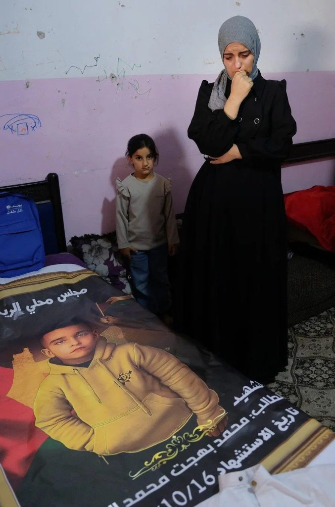 The bed belongs to Muhammad al-Hallaq, a 9-year-old who was in fourth grade. He received the backpack the day he was killed. The white garment is the festive outfit he wore in the local mosque during the Friday prayers. The tearful woman next to the bed is Alia, his mother, an impressive woman of 33, the mother of four, including the dead boy.