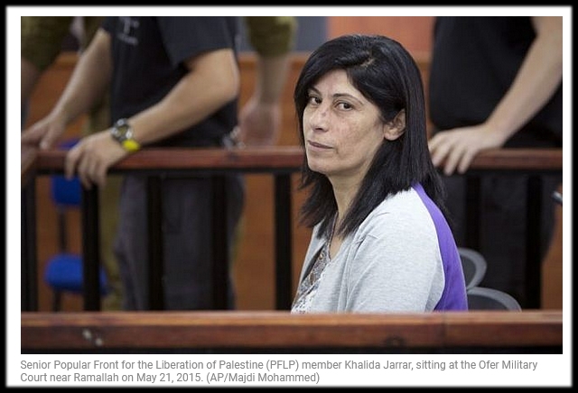 The PFLP has a political and a military wing. Khaled belongs to its political wing. She is an elected member of the Palestinian parliament but that has not prevented the ‘democratic state’ of Israel from gaoling her for nakedly political reasons. There is no ‘security’ issue, the usual justification for racism in Israel.