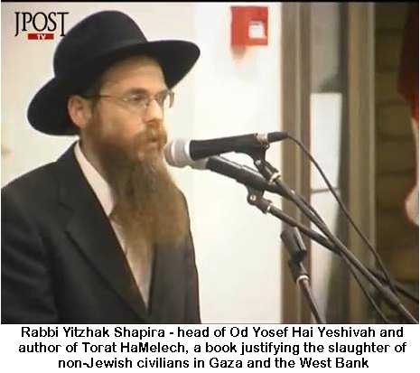 Rabbi Yitzhak Shapira, no stranger to this blog, is the head of the Yeshiva. Among his literary accomplishments is Torat HaMelech which justifies the murder even of Palestinian children and babies. Truly what Yeshoyahu Liebowitz called a Judeo-Nazi style settlement.