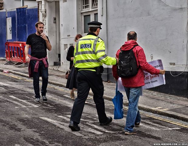 | Exceptionally the Police escort one particularly abusive Zionist across the street |