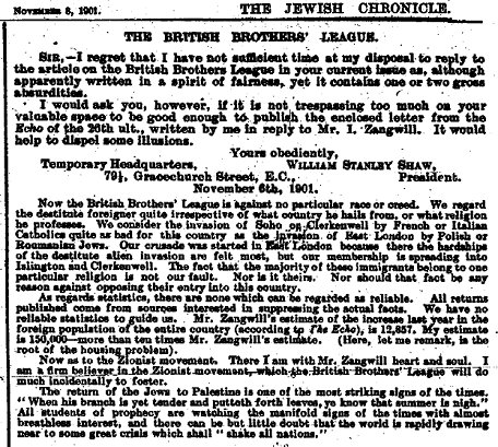 | British Brothers League – opposed the entry of Jewish refugees but they were ardently in favour of Zionists |