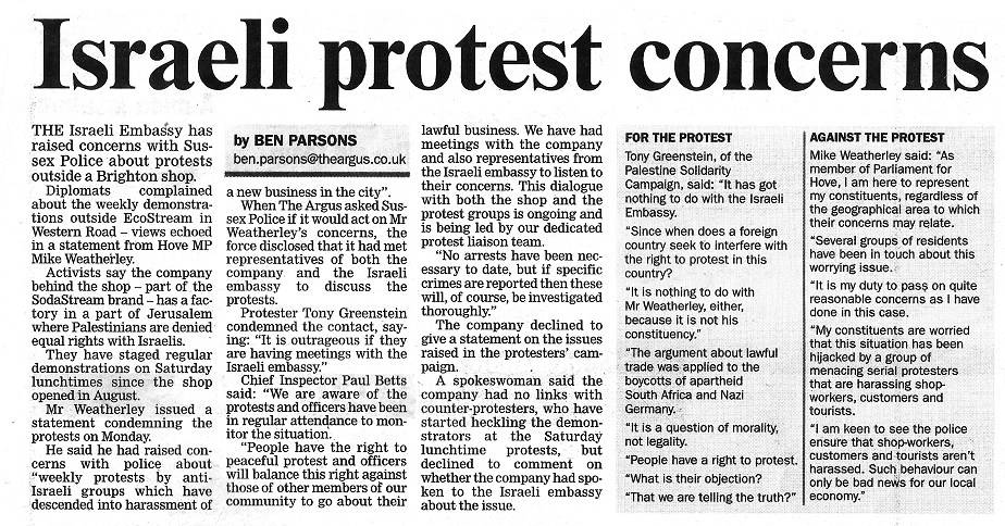 Today the Argus printed a quite good article including a debate between me and the local Tory MP. The battle is on and it is essential to ensure that Sodastream doesn’t get a foot hold in Britain. Choosing Brighton for their greenwash was a big mistake!