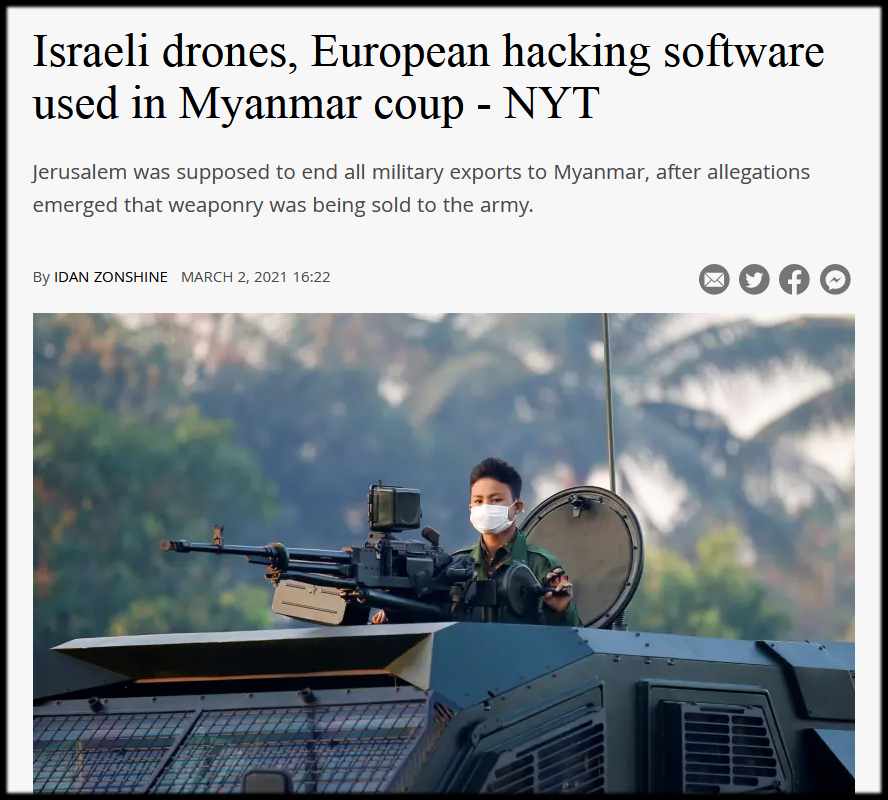 The Jerusalem Post reported that Elbit and 2 other Israeli companies, Cellebrite and Gaia Automotive Industries, supplied drones that have been used in the Myanmar coup. Jerusalem was supposed to end all military exports to Myanmar, after allegations emerged that weaponry was being sold to the army.