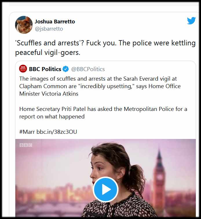 It was not surprising that officers from the Met should object so strongly to vigils in support of Sarah Everard that they attacked a peaceful vigil at Clapham Common using the COVID regulations as an excuse.
