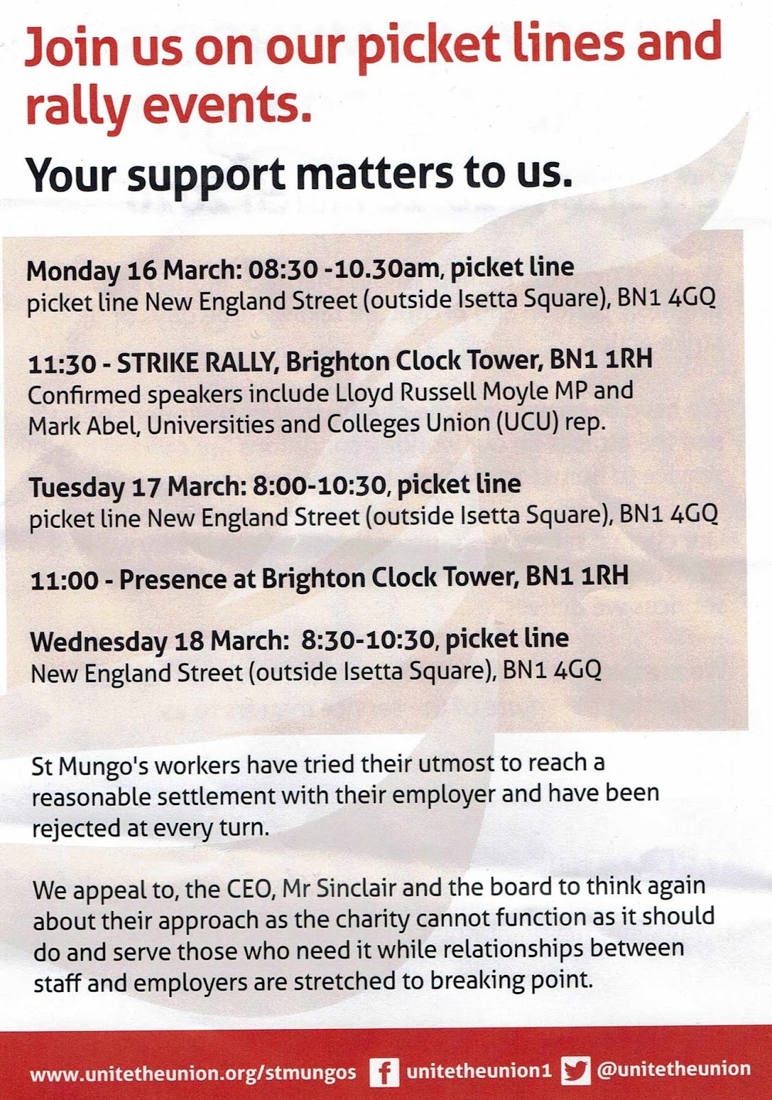 Tomorrow and Wednesday are further strike days for St Mungo’s. People will be gathering at Brighton’s Clock Tower at 11 am.