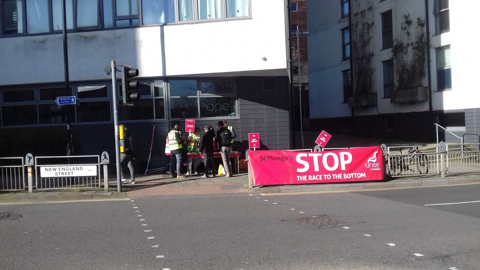 Today saw the first of a 3 day strike by Unite workers at St Mungo’s, Britain’s largest homelessness charity. Workers in Brighton, Bristol and London joined the strike after an 83.7% yes vote in a strike ballot.