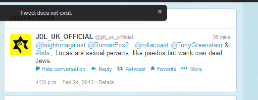 If you want to a glimpse of the warped and twisted mentality of the Jewish Defence League, whom the organiser of the far-right Zionist/Christian fundamentalist demonstrators, Simon Cobbs, thinks are a fine bunch of people, then take a look at a tweet which appeared today from what is apparently the more ‘moderate’ of the two JDL twitter accounts.