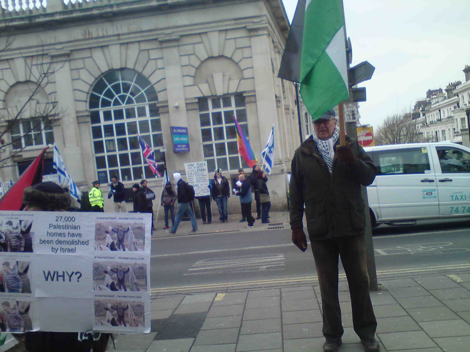 It was a bitterly cold day today and well done to all those who braved the elements. The Zionists seemed particularly bedraggled and most of them appeared to be non-Jewish Christian fundamentalists. It included poor Jill Young, the mad Fundie in blue, who insists on carrying a poster of me which she has hideously distorted. It must be a sign of love, since these Christians are taught to love thine enemy. Despite being an unassuming person, when she was expressing too much concern over my son’s presence (he is autistic) I was forced to tell her that she looked like the female equivalent of Jimmy Saville. She seemed quite pleased at the comparison.