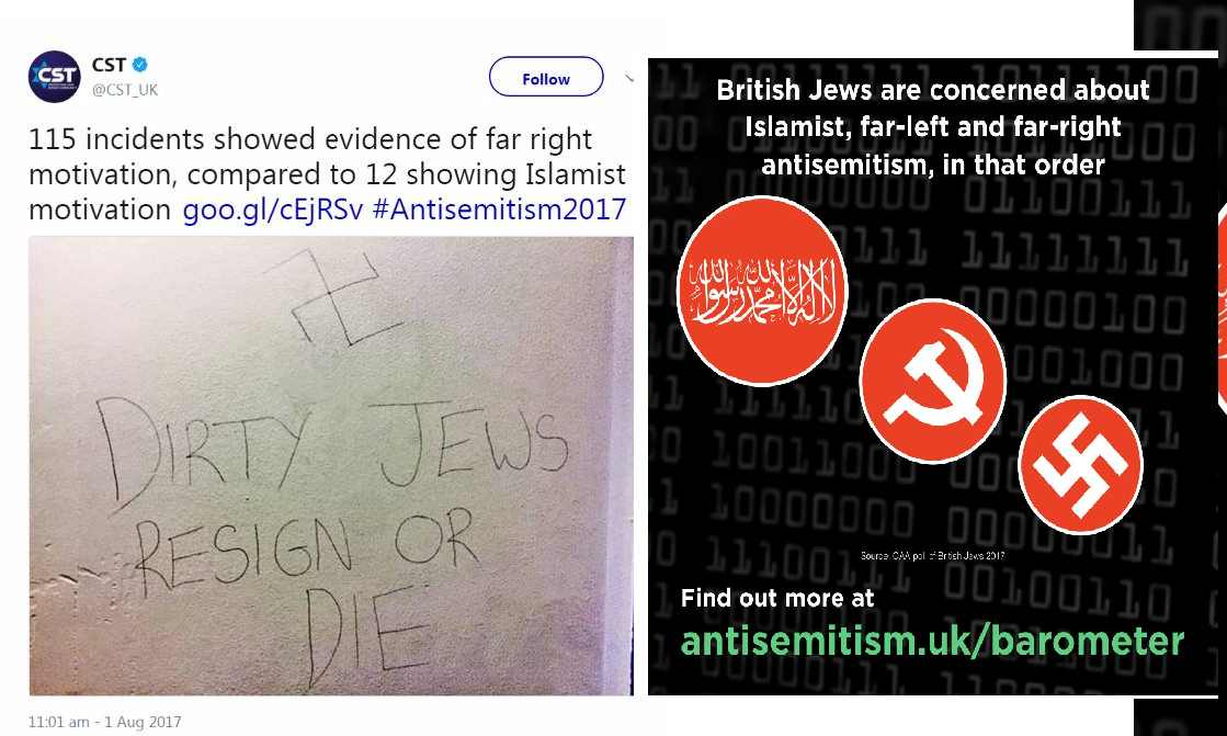 | Despite the evidence from the CST’s Incidents Report that 115 out of 176 anti-Semitic incidents are from the far-Right, it is ‘Islamist’ and ‘far-left’ anti-Semitism that concerns the racist CAA |