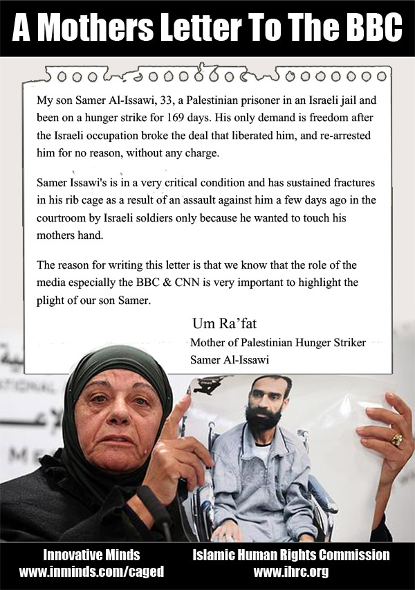Both Samer and Ayman are dying. They have shown unbelievable strength in resisting their oppression. The very least we can do is give voice to their heroic resistance, to their hunger strike. We need to ensure the media is shamed in to covering their story. Publicity for their plight is the first step towards their liberation.