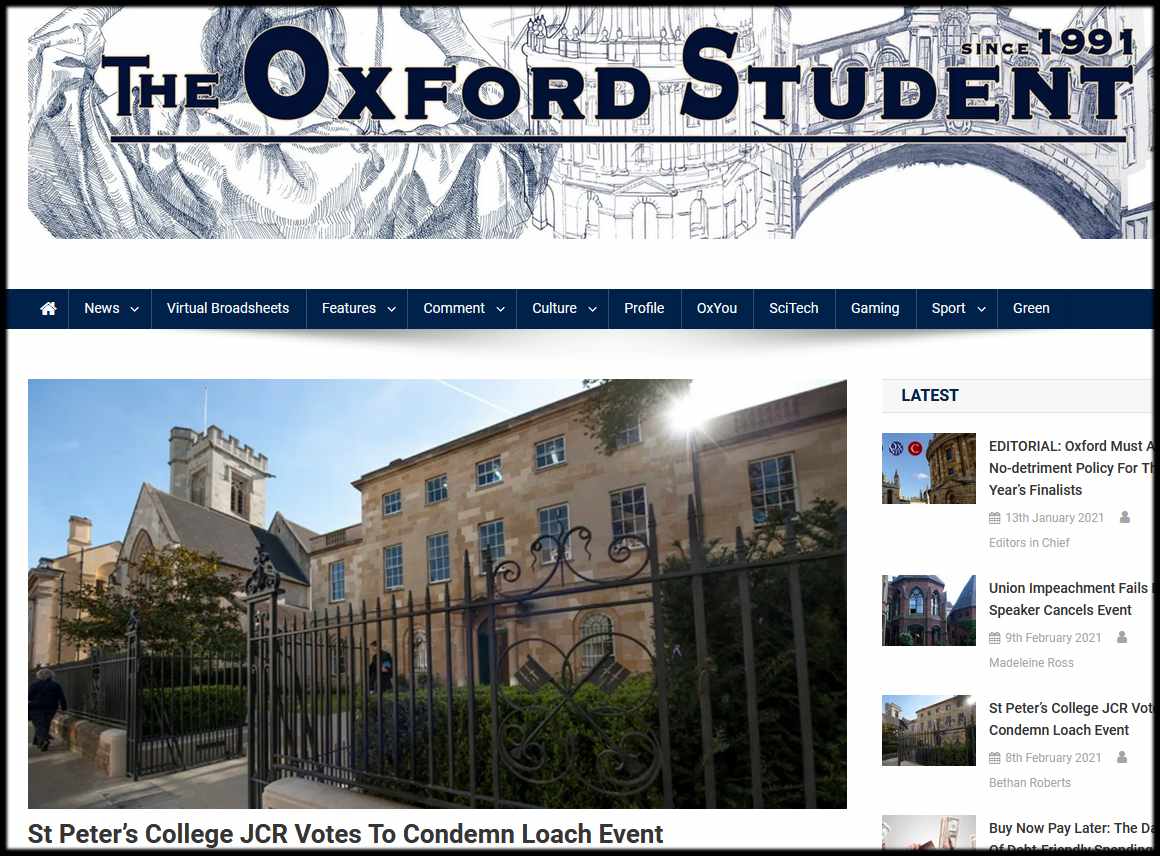 There were a number of articles in Oxford’s other student newspaper Cherwell. Apparently Wadham College had a meeting on 9th February to decide whether or not to condemn St. Peters College and its master Professor Judith Buchanan for not no platforming Ken Loach. When I was a student we no platformed fascists not anti-fascists!