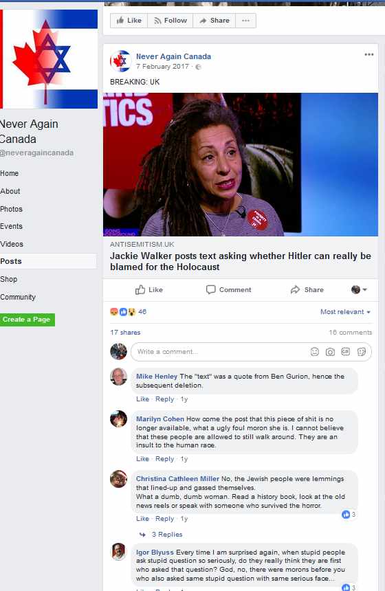 a. GF alleged that the ‘only person publicising it was Ms Walker herself’, thus blaming the victim. The Canadian Zionist Group ‘Never Again’ shared the post directly from D’s website. Not only was there an extensive discussion underneath but there were 17 shares.