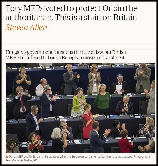 Contrast this with the Guardian’s ‘Tory MEPs voted to protect Orban the authoritarian. This is a stain on Britain.’