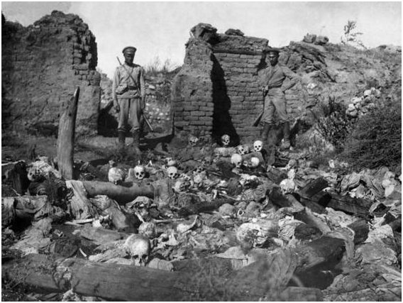 Turkish soldiers standing over the skulls of dead Armenian villagers