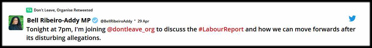 Last Wednesday I tuned into the meeting of Don’t Leave, Organise. The meeting started at 7 p.m. and I came in about 20 minutes late as I’d been out for my daily walk. Little did I realise that I was about to be at the centre of another manufactured storm about ‘anti-Semitism’.