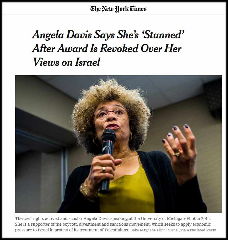 “Something not included in the Institute’s publicity for the event is that Davis has also been an outspoken voice in the boycott Israel movement, and advocates extensively on college campuses for the isolation of the Jewish state, saying Israel engages in ethnic cleansing and is connected to police violence against African-Americans in the United States,”