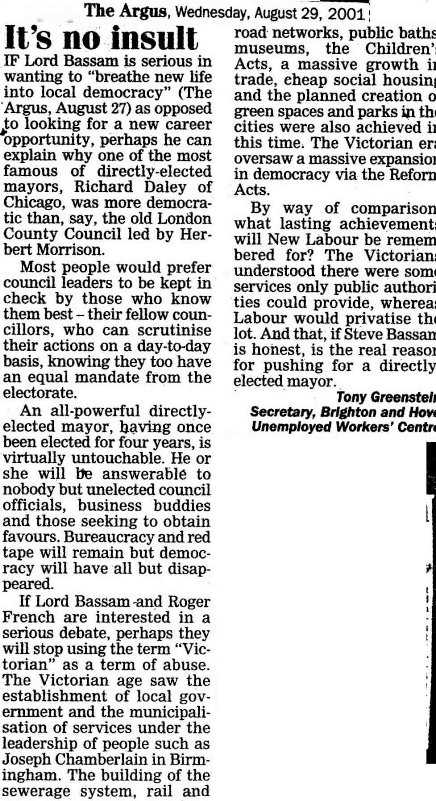 | The newly re-established Brighton Unemployed Centre (which Bassam had done his best to close) led the campaign against a directly-elected Mayor |