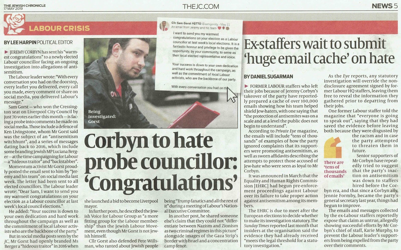 On page 5 Harpin had another fake ‘Labour anti-Semitism’ story, ‘Corbyn to hate probe councillor –‘Congratulations’and beneath it a story on hitherto unknown ‘Labour veterans resign citing anti-Semitism’ and yet another article on the same page ‘Ex-staffers wait to submit ‘huge email cache’ on hate’ which quotes a Private Eye story (by Ratbiter Nick Cohen) on the ‘inquiry’ by the State’s Equality and Human Rights Commission into Labour’s ‘anti-Semitism’.