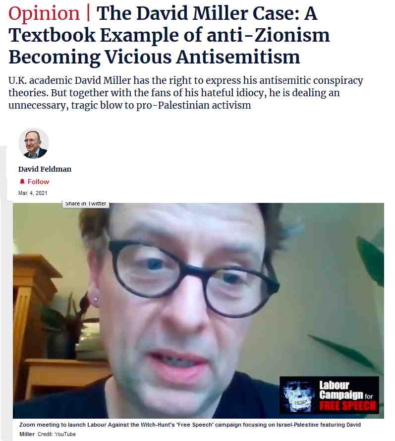 The whole Zionist spectrum, including Israel’s Ha’aretz, is supporting the attack on David Miller with articles by Professor David Feldman and Nicole Lampert. I have previously blogged about Feldman, ‘The Academic as an Establishment Whore.
