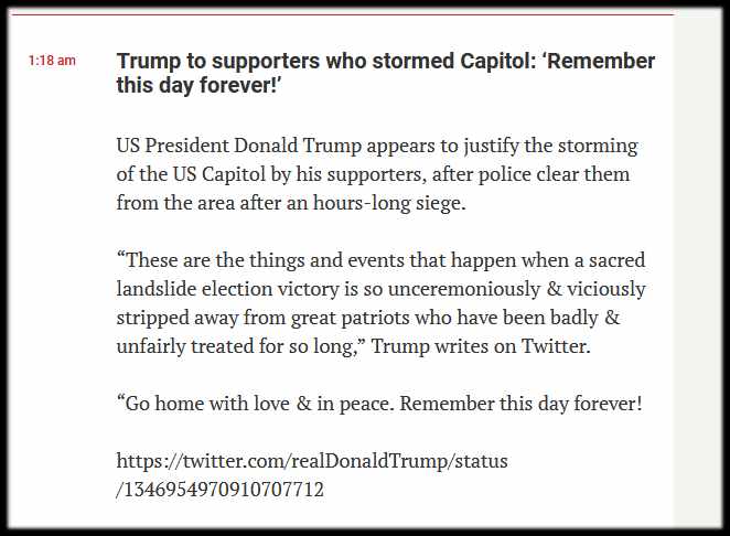 Then when he realised that he had bitten off more than he could chew he backtracked and issued a video condemnation: “Like all Americans, I am outraged by the violence, lawlessness, and mayhem,” Trump said, adding, “To those who broke the law: You will pay.” Lies come easily to the man who, the day before, told the mob how much he ‘loved’ them.