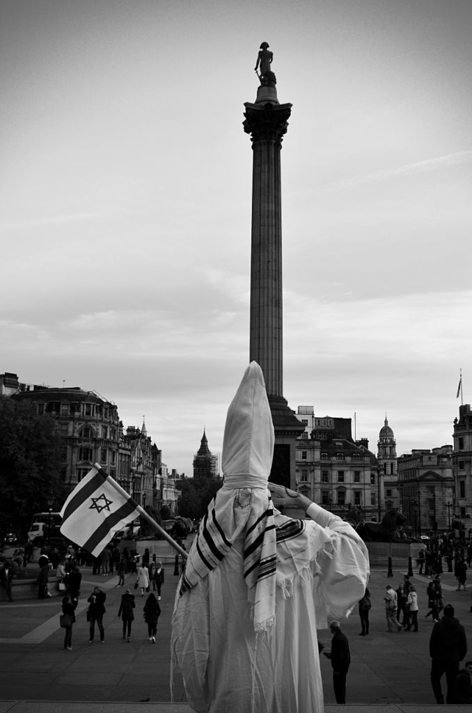 In the performance, an actor dressed in a Klu Klux Klan cloak, partly made from Mualem-Doron’s Jewish prayer shawl, is standing and saluting Nelson’s statue whilst holding the Israeli Flag. The installation in the gallery includes photographs from this intervention as well as two others that took place in Tel Aviv and led to a near arrest of the artist.