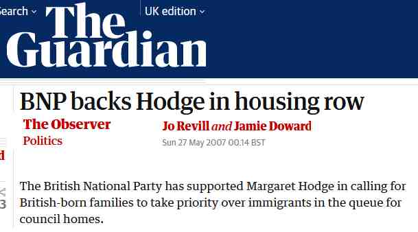 The British National Party has supported Margaret Hodge in calling for British-born families to take priority over immigrants in the queue for council homes. They have seized on the Labour MP’s comments as a vindication of its extremist policies. ‘Labour MP Margaret Hodge deserves a word of compliment from the BNP for her efforts to raise the thorny issue of social housing for native Britons..