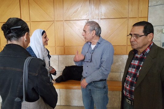 | Dareen Tatour (left) and Professor Calderon (center) speak at the Nazareth Magistrates Court, March 19, 2017. (Yoav Haifawi) |
