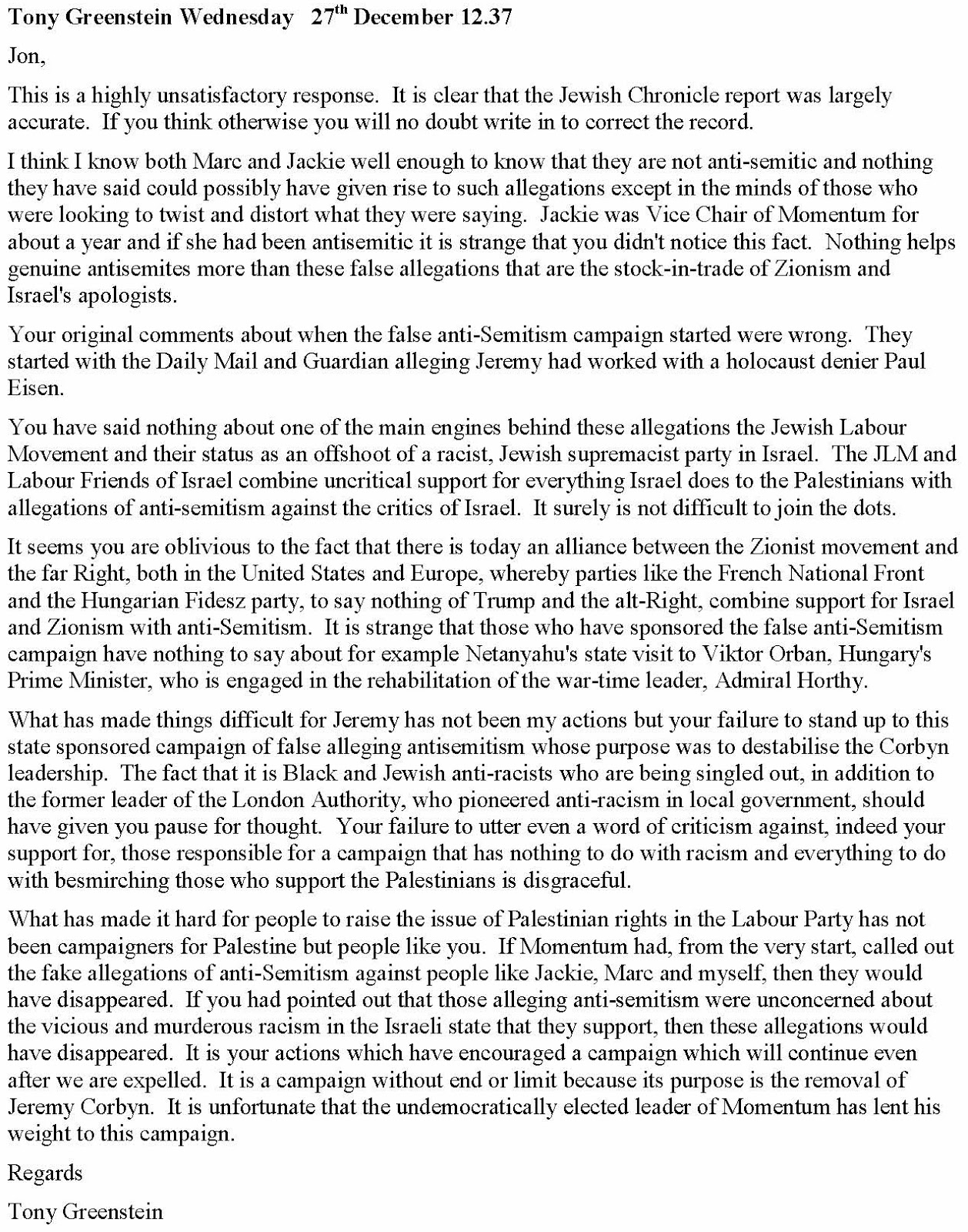 is fully aware that Jackie and Marc are anti-racists of long standing. Marc’s ‘offence’ was to criticise Ruth