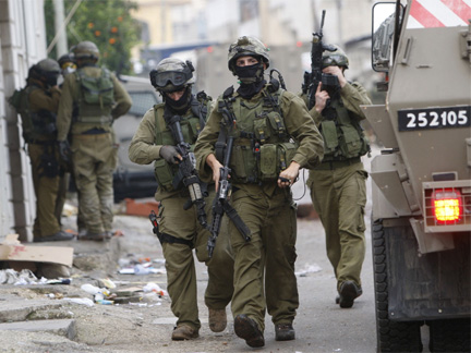 | Israeli soldiers patrol a street during an Israeli army raid in the West Bank City of Nablus on Saturday. (Photo: Reuters) |