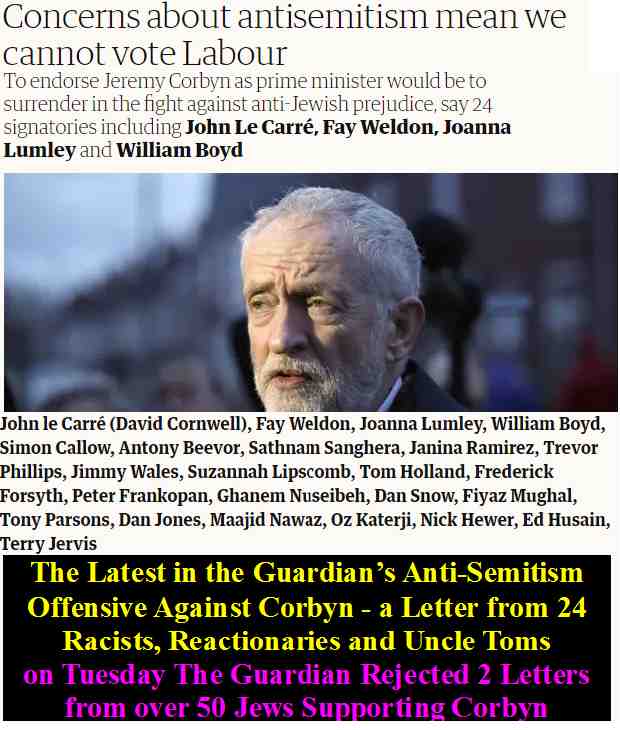 Joanne Lumley is a Green Party supporter. Jimmy Swales of Wikipedia is a well known anti-Corbyn opponent. Fay Weldon is an Islamaphobe. But when needs must the Guardian is prepared to ignore genuine racism. The 24’s excuse is that they’ve listened to their Jewish friends and felt their ‘pain’.
