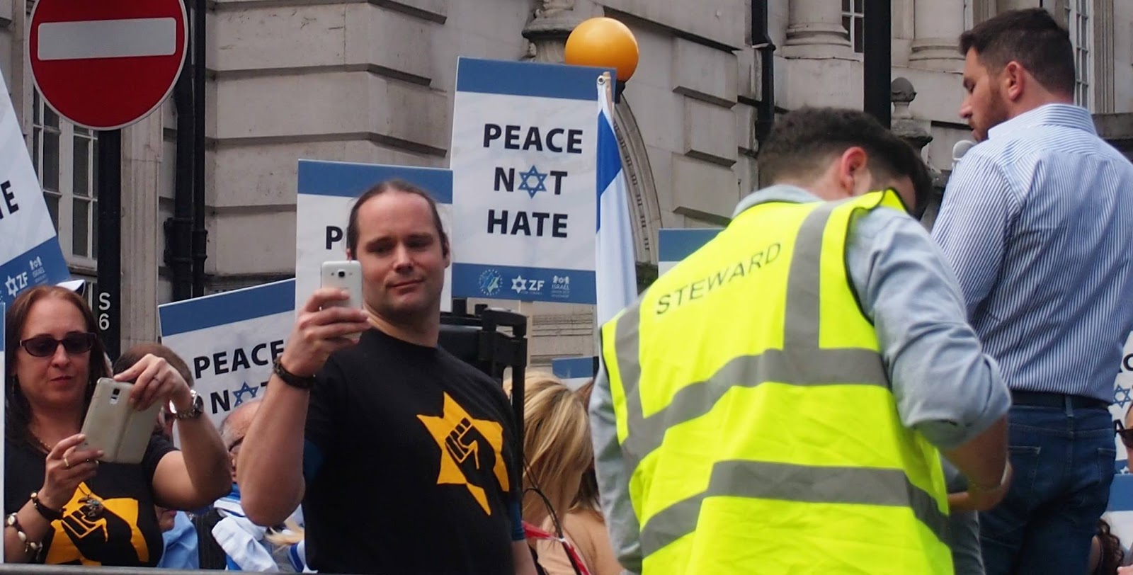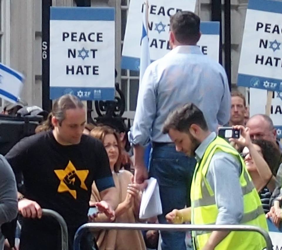 | Jonathan Hoffman, former Co-Vice Chair of Zionist Federation at Grosvenor Sq. Sun 3 July with Roberta Moore and Robert de Jong -please feel free to use as you wish. |